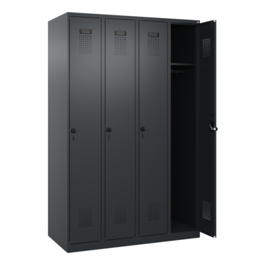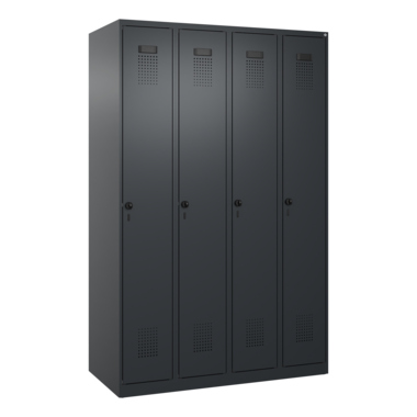 Garderobenschrank Evolo PLUS mit hochwertiger Einbrennbeschichtung für hohe UV- und Korrosionsbeständigkeit. Geschlossene und abgeschrägte Seitenprofile für leichte Innenreinigung und komfortable Entnahme von Kleidung. Türen mit Soft-Anschlag und geschlossenen Seitenprofilen für höchste Stabilität, mit reinigungsfreundlichem Belüftungslochbild oben und unten. Aufhängung in stabilen Drehbolzen. 2 ergonomische Sicherheits-Drehriegel für Vorhangschlösser mit Bügelstärke 6 bis 8 mm. Inkl. Tür-Schutz. Mit schwarzen, selbstklebenden Kunststoff-Etikettenrahmen, inkl. Klarsichtkunststoff-Abdeckung und weißem Etikett zur individuellen Beschriftung. Achtung: Anlieferungsmöglichkeit durch Sattelschlepper muss gegeben sein.