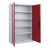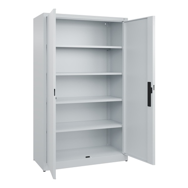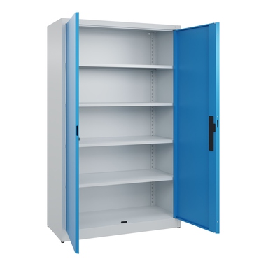 Büroschrank Acurado. Korpus aus stabiler Stahlkonstruktion mit hochwertiger Einbrennbeschichtung für hohe UV-Beständigkeit. Mit Bodengleitern als praktischem Schrank- und Fußbodenschutz. Hohe Flexibilität der Inneneinrichtung durch Höhenverstellbarkeit im Raster. Türen mit geschlossenen Seitenprofilen und verdeckten Schließstangen für höchste Stabilität und Einbruchsicherheit, mit Softanschlag. Türaufhängung oben und unten in Drehbolzen. 3-Riegeliges Ergo-Lock Griffschloss für optimale Bedienungssicherheit und Verschleißfestigkeit. Achtung: Anlieferungsmöglichkeit durch Sattelschlepper muss gegeben sein.