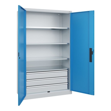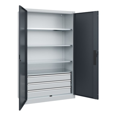 Werkzeugschrank mit Schubladen Acurado, Korpus aus stabiler Stahlkonstruktion mit hochwertiger Einbrennbeschichtung für hohe UV-Beständigkeit. Mit Bodengleitern als praktischer Schrank- und Fußbodenschutz. Hohe Flexibilität der Inneneinrichtung durch Höhenverstellbarkeit im Raster. Türen mit geschlossenen Seitenprofilen und verdeckten Schließstangen für höchste Stabilität und Einbruchsicherheit. Mit Soft-Anschlag. Türaufhängung in außen liegenden Scharnieren mit großzügigem Öffnungswinkel. 1 Ergo-Lock Griffschloss für optimale Bedienungssicherheit und Verschleißfestigkeit. Türen zueinander schlagend für gemeinsamen Verschluss. Achtung: Anlieferungsmöglichkeit durch Sattelschlepper muss gegeben sein.