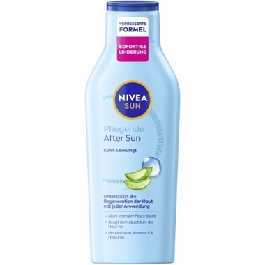Die NIVEA SUN After Sun Feuchtigkeitslotion beruhigt und pflegt die Haut nach dem Sonnenbad. Die Formel mit Bio-Aloe Vera, Vitamin E und Hyaluron unterstützt Regeneration sonnengestresster Haut mit jeder Anwendung. Die schnell einziehende Lotion spendet über 48 Stunden intensive Feuchtigkeit, beugt dem Abschälen der Haut vor und lindert sofort Anzeichen von Sonnenstress. Ihre leichte, nicht klebende Formel sorgt für ein gepflegtes und gesundes Hautgefühl. Besonders hautverträglich und speziell auf die Bedürfnisse der Haut nach dem Sonnenbad abgestimmt. Ideal für die tägliche Anwendung als Teil deiner ganzheitlichen Sonnenpflege-Routine: Tagsüber LSF, abends After Sun. Inhaltsstoffe: Aqua, Alcohol Denat., Isopropyl Palmitate, Glycerin, Glyceryl Stearate SE, Hydroxypropyl Starch Phosphate, Sodium Hyaluronate, Tocopheryl Acetate, Aloe Barbadensis Leaf Juice Powder, Xanthan Gum, Cetyl Palmitate, Sodium Cetearyl Sulfate, Hydroxyacetophenone, Phenoxyethanol, Linalyl Acetate, Linalool, Pinene, Terpineol, Pogostemon Cablin Oil, Citral, Camphor, Vanillin, Parfum.