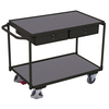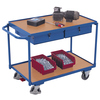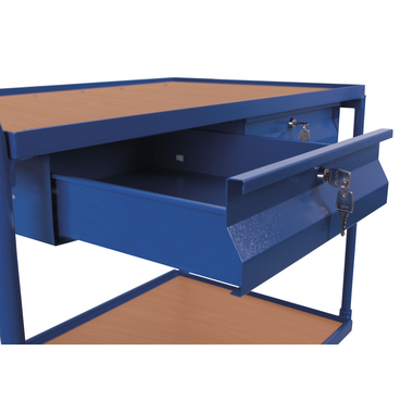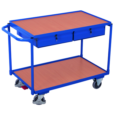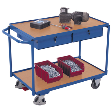 Maximale Ordnung trifft robuste Konstruktion: Dieser Tischwagen mit 2 Ladeflächen und 2 Schubladen überzeugt durch sein flexibles Baukasten-System mit innovativem L-Profil und stabilen Etagen aus Winkelstahl. Die Holzwerkstoff-Ladeflächen mit 15 mm Rand sichern Ihr Material, während zwei abschließbare Schubladen (Innenmaß: 39 x 45,5 x 8 cm) wertvolle Utensilien schützen. Spurlos laufende Gummiräder mit Faden- und Fußschutz sowie 2 Lenkrollen mit patentiertem EasySTOP-Bremssystem sorgen für komfortables, sicheres Handling. Die Oberfläche ist dauerhaft geschützt, schlag- und kratzfest - ideal für anspruchsvolle Arbeitsumgebungen.